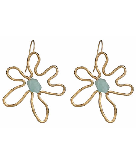 These flower and stone earrings by MerriJane Morrison have a whimsical appeal. The six-petal 18k gold plated earrings are large and feature a hammered texture. A beautifully crafted aquamarine stone sits in the center of the flower, which drops from a long hook.