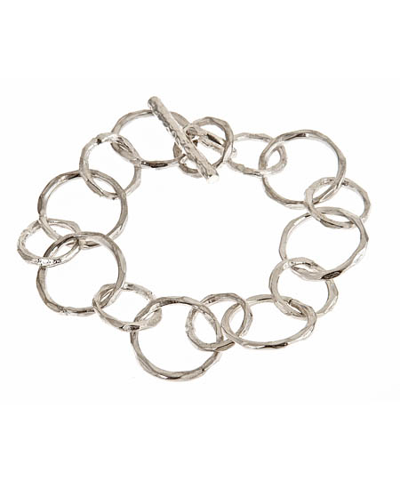 Dress your wrist in the simple elegance of this silver circle bracelet by MerriJane Morrison. The bracelet is completed with more than a dozen sterling silver open circles with a hammered finish. The circle links make this bracelet a stylish piece.