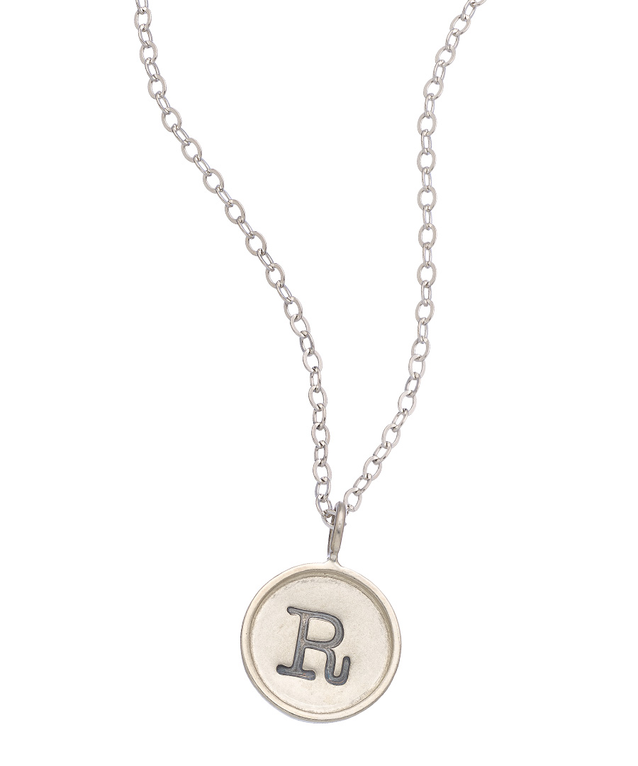 The Metal Pressions 5/8 inch sterling silver personalized typewriter key pendant necklace is available with your choice of one initial in typewriter font. The face of the pendant has a satin finish and the rim is available in your choice of rose gold or sterling silver. Please specify a single letter or number when ordering. Please specify chain length and rim color when ordering. Necklace fastens with a lobster claw clasp.