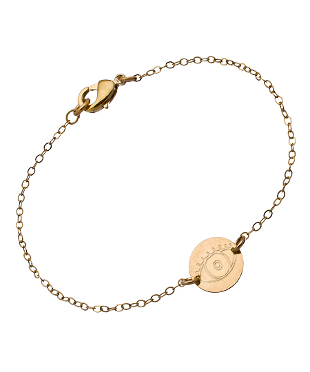 This gorgeous Miriam Merenfeld gold engraved evil eye bracelet may be more aptly named friendly eye. The handsome engraved symbol, often worn for its protective qualities, is exquisitely crafted and placed on a strong gold chain bracelet. Bracelet fastens with a lobster claw clasp.