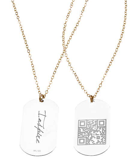 For a necklace unlike any you have ever worn, Miriam Merenfeld presents this amazing 'Live With Passion' scan necklace. You're able to scan the back of sterling silver tag pendant in the QR reader App in your smart phone for a message that reads, 'Live with Passion'. Engraved in front of the pendant is the word 'Inspire'.