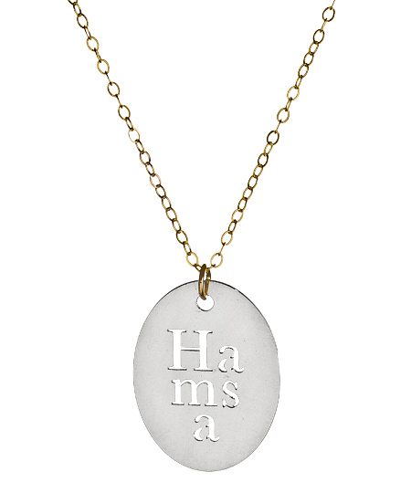 More than just the Hamsa symbol, the sterling silver hamsa oval tag necklace from Miriam Merenfeld actually spells it out. The gold filled cable chain shows of the precisely cut oval sterling silver tag. This necklace fastens with a lobster claw closure.