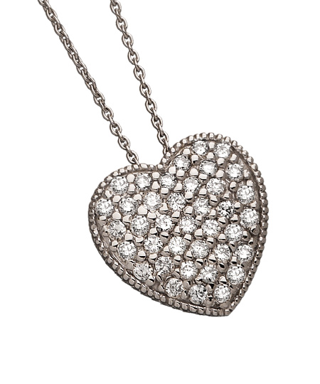 Nothing is classier than this gorgeous heart pendant necklace by Morris & David. The heart pendant makes this 14k white gold piece a great gift for a loved one. The heart itself is flanked by tiny, faceted diamonds.