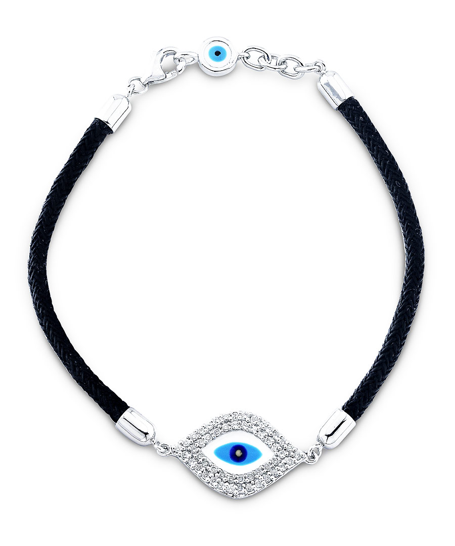 Mystic Light by MK Diamond's bluest eye cord bracelet grounds the spirituality of the evil eye trend with an original mix of luxurious and earthy details. Braided leather cord, capped with white gold, holds two evil eye amulets. The larger is encased in sparkling diamonds. This good luck symbol is as multi-faceted as its wearer.