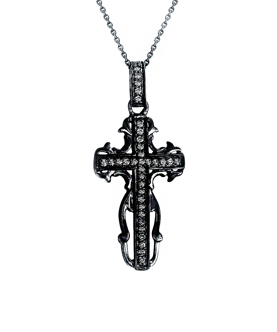 The Mystic Light cross pendant necklace features a gorgeous contrast of light and dark. The white diamond studded cross is surrounded by refined ornate detailing in black rhodium. The stunning pendant hangs from a sterling silver chain.