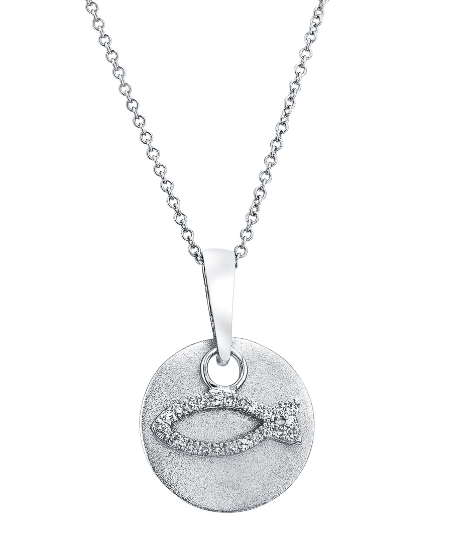 The Mystic Light fish disc pendant necklace offers a refined take on an aquatic theme. The outlined fish shimmers with .10 carats of diamonds against a round sterling silver pendant. This shining pendant hangs from a delicate chain necklace for a divine effect.