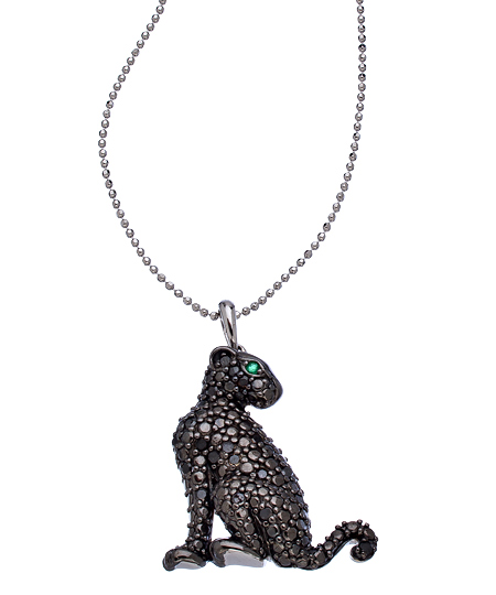 Emerald eyes gleam from this Mystic Light silver, brown and black diamond and emerald leopard pendant necklace. The pave black diamonds sparkle seductively and showcase the brilliant emerald eye. Pendant hangs from a delicate but strong ball chain and has a spring clasp.