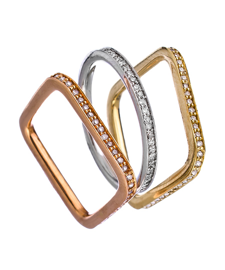 This Mystic Light square gold and diamond band trio is anything but ordinary - just like you. Three bands: in yellow, rose and white gold are scattered with diamonds and look great alone or stacked. This charming trio belongs in your personal jewel collection.