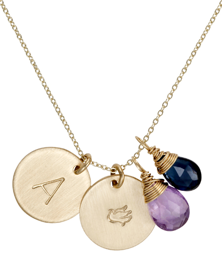 Nashelle's identity lucky charm necklace embodies good luck and great style. 14K gold fill pendants are stamped with a peace dove and any letter you choose. Alongside them float richly hued gems, faceted to twinkle in the light. This is a wonderful necklace suitable for any casual look. Please select your two stone colors from the options below.
