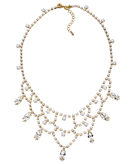 Delicate and feminine, this Nicole Meng rhinestone and gold chandelier bib necklace will give you an air of stylish elegance. Two sizes of faceted white stones provide the framework for a dazzling display of faceted, marquise shaped Swarovski rhinestones. Bonus: this gorgeous and versatile bib also works well as a collar. Necklace has a lobster clasp closure.