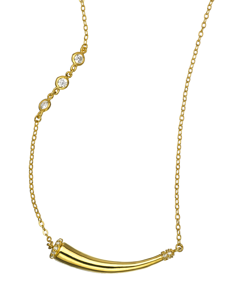 The iconic horn is given modern update, in this Nyla Star gold and CZ horn Cora pendant necklace. Ideally suited for dozens of your favorite looks, the stunning necklace, which features a horn capped with dazzling CZs and bezel set CZ accents, will work well in a layer or be stunning alone. Necklace fastens with a spring clasp.