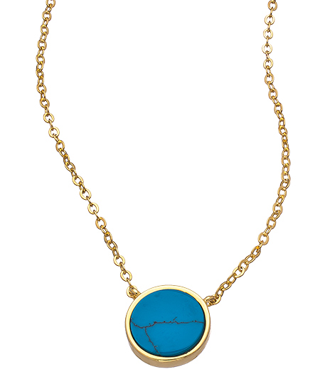 A round pop of color is yours with this Nyla Star Samantha gold and turquoise pendant necklace. The faux turquoise stone features authentic looking veins and is set in a highly polished gold bezel setting. The chain features a generous extender to allow you to adjust this necklace to the perfect length. Necklace fastens with a spring clasp.