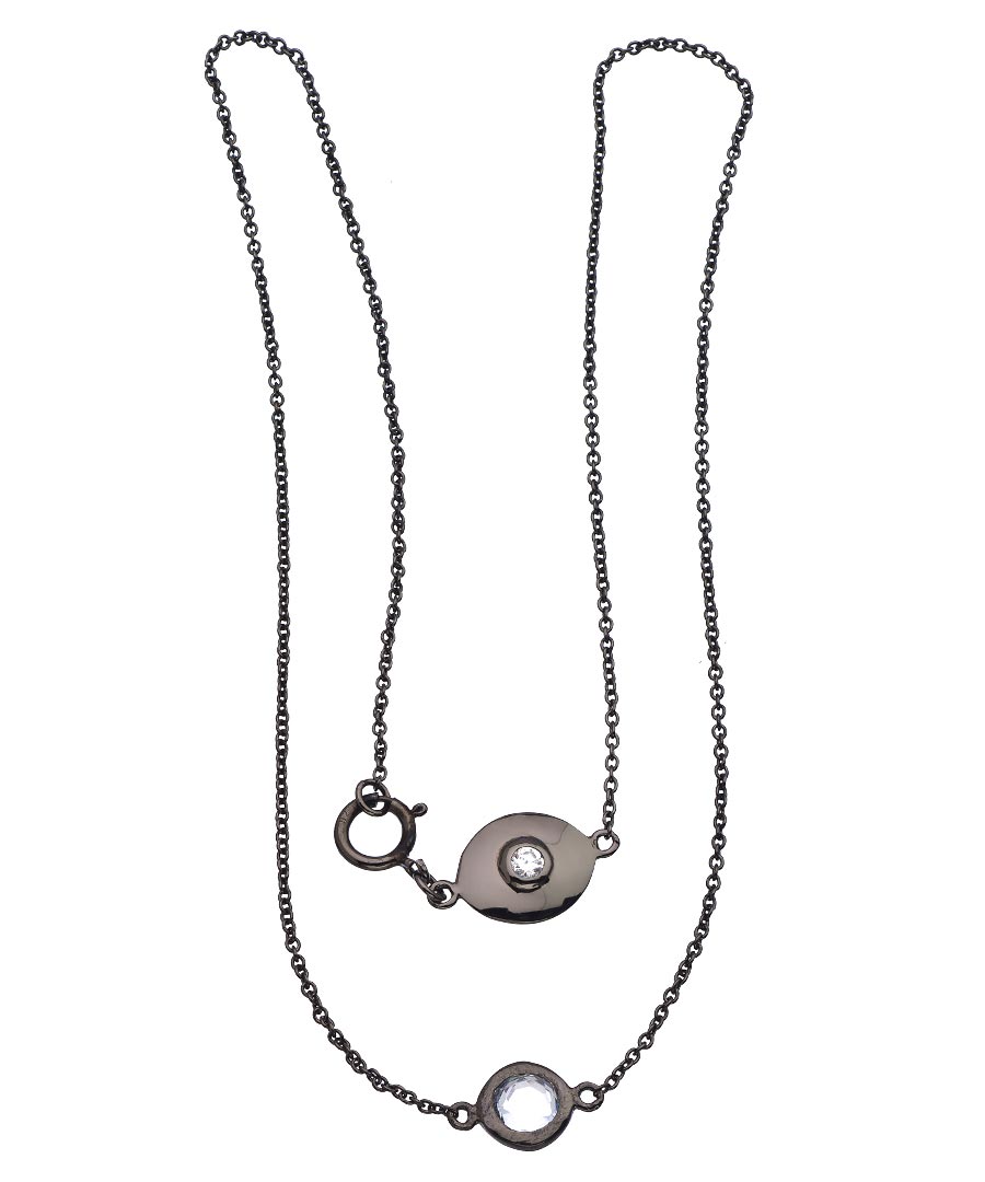 One Oak by Sara's gift for design is on display in this hematite and CZ connector necklace. Two lengths of strong chain are joined by the bezel set CZ. The stunning pendant is accompanied by a bezel set CZ inside a logo disc that sits at the spring clasp. This understated, elegant necklace is a modern classic.
