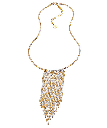 Fifteen graduated lengths of crystal rows set the stage in this OroClone gold and crystal fifteen-row necklace. The gorgeous detail features crystal rows that swing independently - the detail is also slightly curved at the top for added flair. Necklace fastens with a lobster claw clasp.