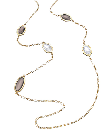 Featuring three, gold, bezel set stones each; this OroClone gold, rock crystal and smoky quartz linear necklace is perfect for embracing the layered necklace trend. Also stunning as a long necklace, this beautiful piece features an extender to adjust to the perfect layer length and fastens with a lobster claw clasp.