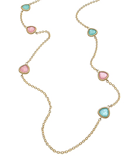 Soft, pastel pink and green stones grace the gleaming gold chain in this OroClone gold, rose aventurine and amazonite linear necklace. Long enough to wrap, and with a generous extender for adjusting to the perfect length - this beautiful piece also works well as a long necklace. Necklace fastens with a lobster claw clasp.