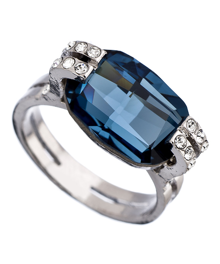 Luminous and hypnotic, this OroClone silver and denim blue Swarovski crystal ring has the look of fine jewelry: superb design, artisan craftsmanship and best of all, plenty of sparkle! A cushion cut Swarovski denim blue stone is set between two connected silver bands that are embellished with rows of sparkling crystals. Please specify ring size when ordering.