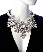 Make a bold and dramatic statement with this Otazu silver, pearl and Swarovski crystal bib necklace. The bib is comprised of three oversized crystal flowers with large oval stones, surrounded by fields of sparkling Swarovski crystals. A cluster of pearls is gathered on the chain, which fastens with a box tab insert.