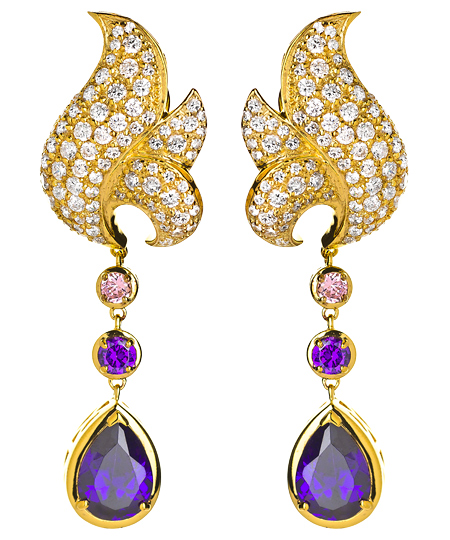 Step out in grandiose style with the Icarus drop earrings from Ponponella. The fit for a princess look includes synthetic amethyst, synthetic pink sapphire and synthetic diamond stones. These earrings fasten with an Omega back closure for pierced ears.