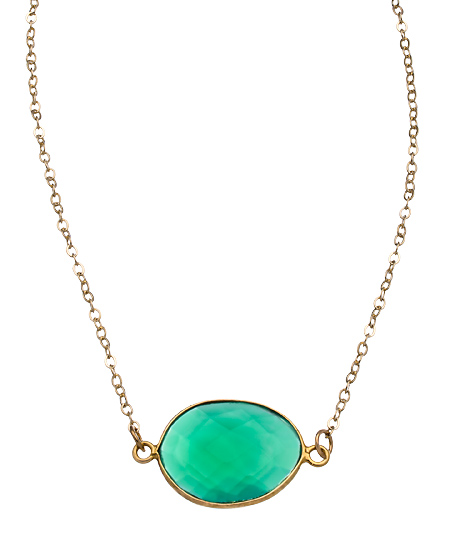 This alluring green crystal pendant necklace from Privileged is simply ravishing! The elegant pendant is an oval cut deep green faceted crystal that sways gracefully from a slim gold plated chain. With it's bright and brilliant color, no other accessory is needed for your look other than a pair of matching gemstone earrings.