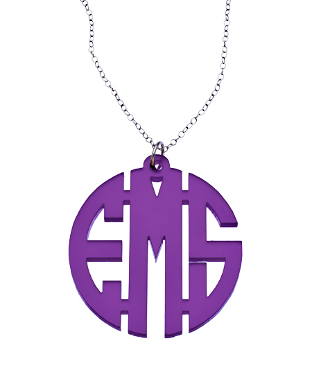 Shine bright with this head-turning and stylish purple acrylic block cutout 1 1/2 inch monogram necklace. This necklace has a silver, rose gold or gold vermeil split chain. This personalized necklace is just what a girl needs to show off!