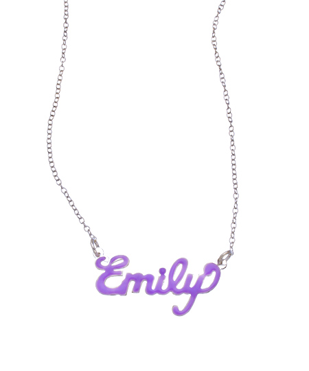 Purple is the color of kings and queens, so what better color to select for your distinctively beautiful monogram than this purple enamel nameplate necklace. Hand carved, so each piece is unique. Please also select either a 16 or 18-inch sterling silver split chain.