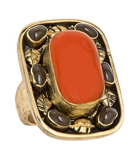 The Rane coral ring has an easy, bohemian quality that is perfect for everyday wear. A vine of raised leaf details and organically shaped olive resin encircles the central piece of coral resin. The smooth bezel settings and hammered band are crafted of brass.