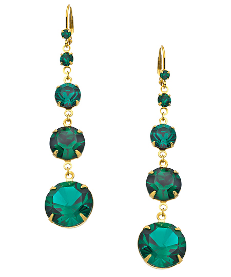 Hypnotic emerald crystals are the focal point of these Roberta Chiarella gold and emerald crystal fairy tale earrings. Graduated in size from top to bottom, the faceted crystals have the appearance of genuine emeralds. Suitable for your fanciest ball gown, these gorgeous earrings will claim a treasured place in your personal jewelry collection. Earrings have a lever back closure for pierced ears.
