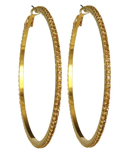 Your look will always shine if you are wearing these hippie hoop earrings in gold by Roberta Chiarella. A beautiful embellishment of light topaz stones are decked along the outer ring of the hoops. The gold plated earrings sparkle and shine as they dangle from your ears.