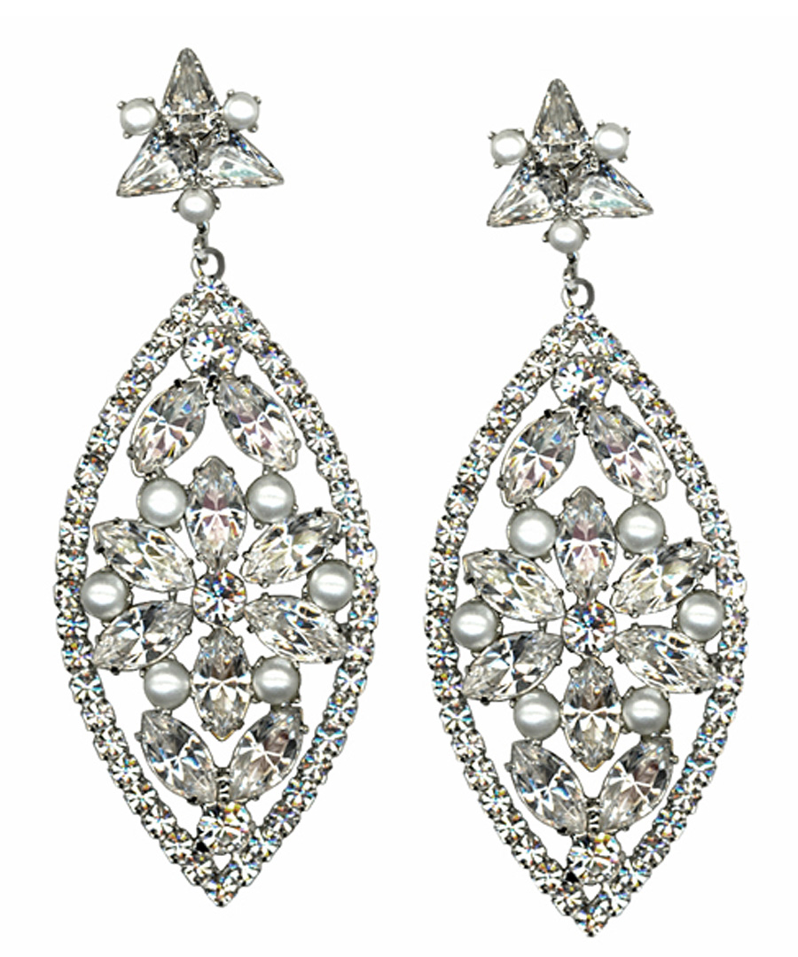 Feel like hollywood royalty in the Roberta Chiarella remarkable earrings. These glamorous earrings are guaranteed to be show stoppers, with ornate Swarovski crystal and faux pearl detailing on the triangular post and the large marquise-shaped drop. The platinum plated post backs are designed for pierced ears.