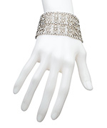 Old world artistry meets new world style and luxury. A wide bracelet is carved with whimsical spirals and swirls, an ornate ivy motif. Two variations include light topaz on 22k gold plate and clear crystal on platinum plate. Wear alone or together for two tone versatility.