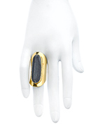 Spot on trend, this Robyn Rhodes gold and black jade spear cigar band ring makes a bold, sleek statement. The matte black jade spear is a gorgeous focal point, complemented perfectly by the gleaming gold cigar band ring. A hammered gold bezel completed the modern look. Ring is adjustable for the perfect fit.