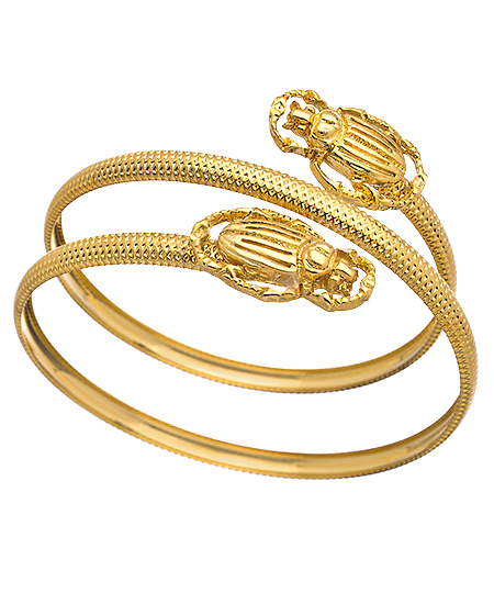 Robyn Rhodes has done it again, with this gold and scarab spiral bracelet or arm cuff. Two exquisitely detailed scarab beetles appear at either end of a serpentine coil that wraps twice around the wrist or the forearm.