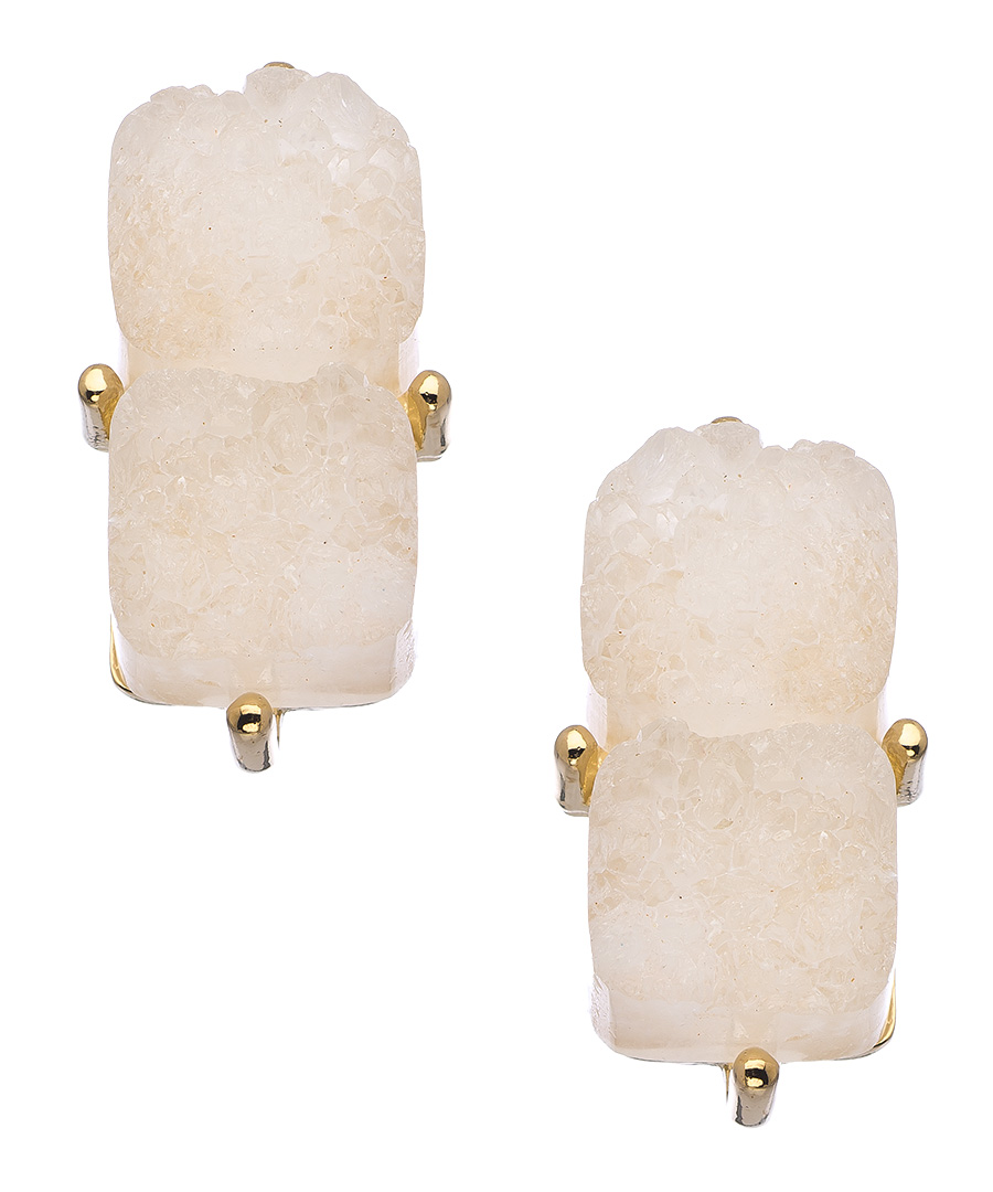 An oversized quartz stone is set in gleaming gold in these dramatic Roman Luxe bold gold and quartz druzy earrings. Make a fashion statement with these elegant, natural elements - said to provide power, energy and clarity. Earrings have a post closure for pierced ears.