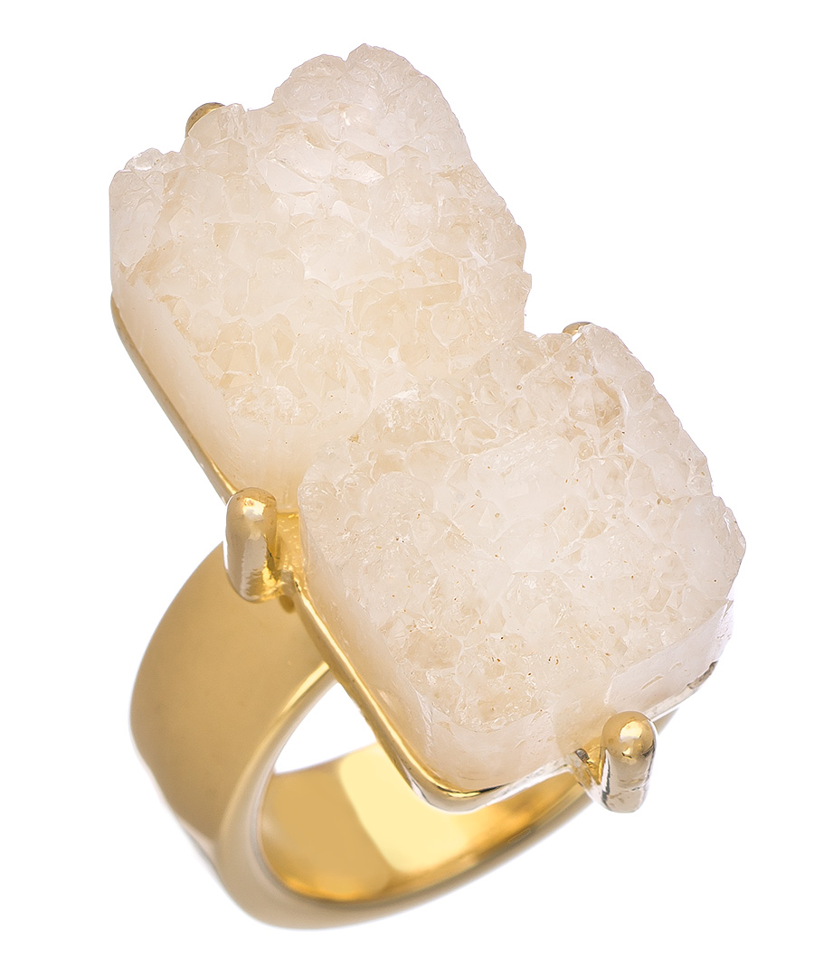 This Roman Luxe bold gold and quartz druzy ring rests on a classic, wide gold band - the ideal backdrop for the stellar druzy stone. The oversized oval shaped quartz really dazzles - sparkling with every move of your hand. Wear this beautiful ring every day - quarts is said to bring power, energy and clarity to the wearer.