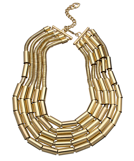 Drape yourself in luxury with this five-strand snake chains and tubes bib necklace from Roman Luxe. Five strands of hollow tubes slide over the luxurious snake chains and gleam enchantingly. This substantial necklace makes the statement you desire. Necklace has a spring clasp closure.