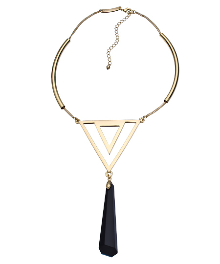 Roman Luxe's gold triangle and jet bib necklace is innovative and unique - and sure to make you the recipient of many admiring compliments. The spectacular pendant is crafted into an irregular hexagon shape and hangs from the two gold triangles that join the strong chain. The contrast of the black and gold makes this necklace particularly eye-catching! Necklace has a spring clasp closure.