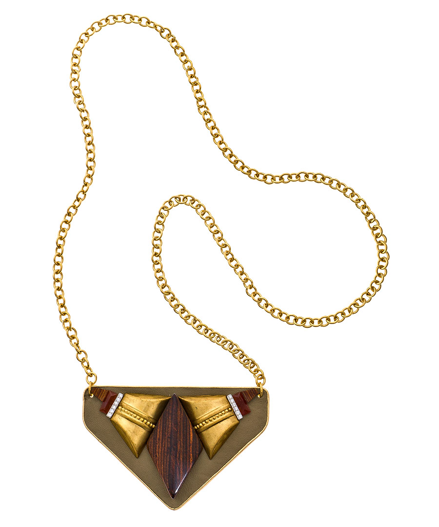 We love the exotic and fun feel of this leather and wood bib necklace from Sandy Hyun. It's embellished with burnt sienna colored lucite pieces at the sides and a triangle shaped wood center. The leather backed bib is anchored to a gold plated cable chain which you can simply slip on over your head.