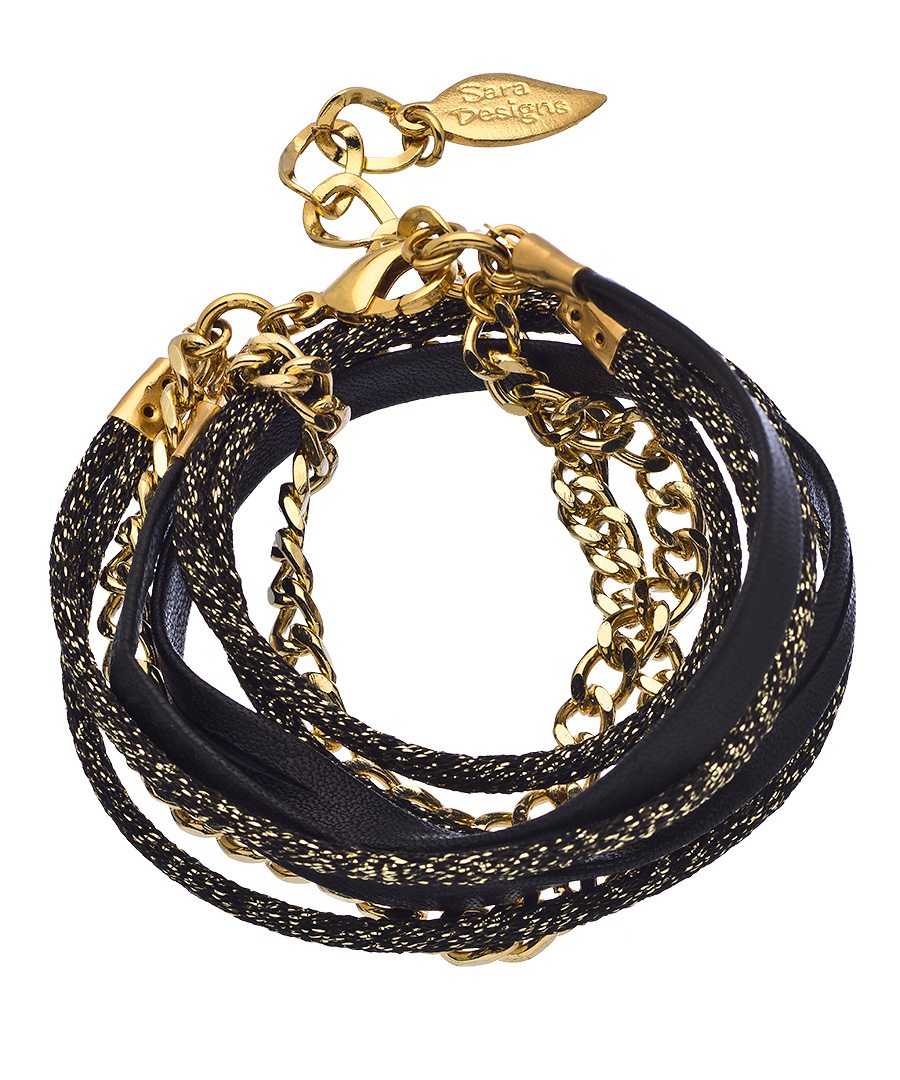 Featuring a sterling silver thread woven into the black silk, this gold and metallic black silk wrap bracelet from Sara Designs will elicit more than a few admiring glances. From the 14k gold plated chain, to the smooth black leather, to the exquisite black and silver silk, this gorgeous bracelet will quickly become your go-to for glamour. Bracelet fastens with a lobster claw clasp.