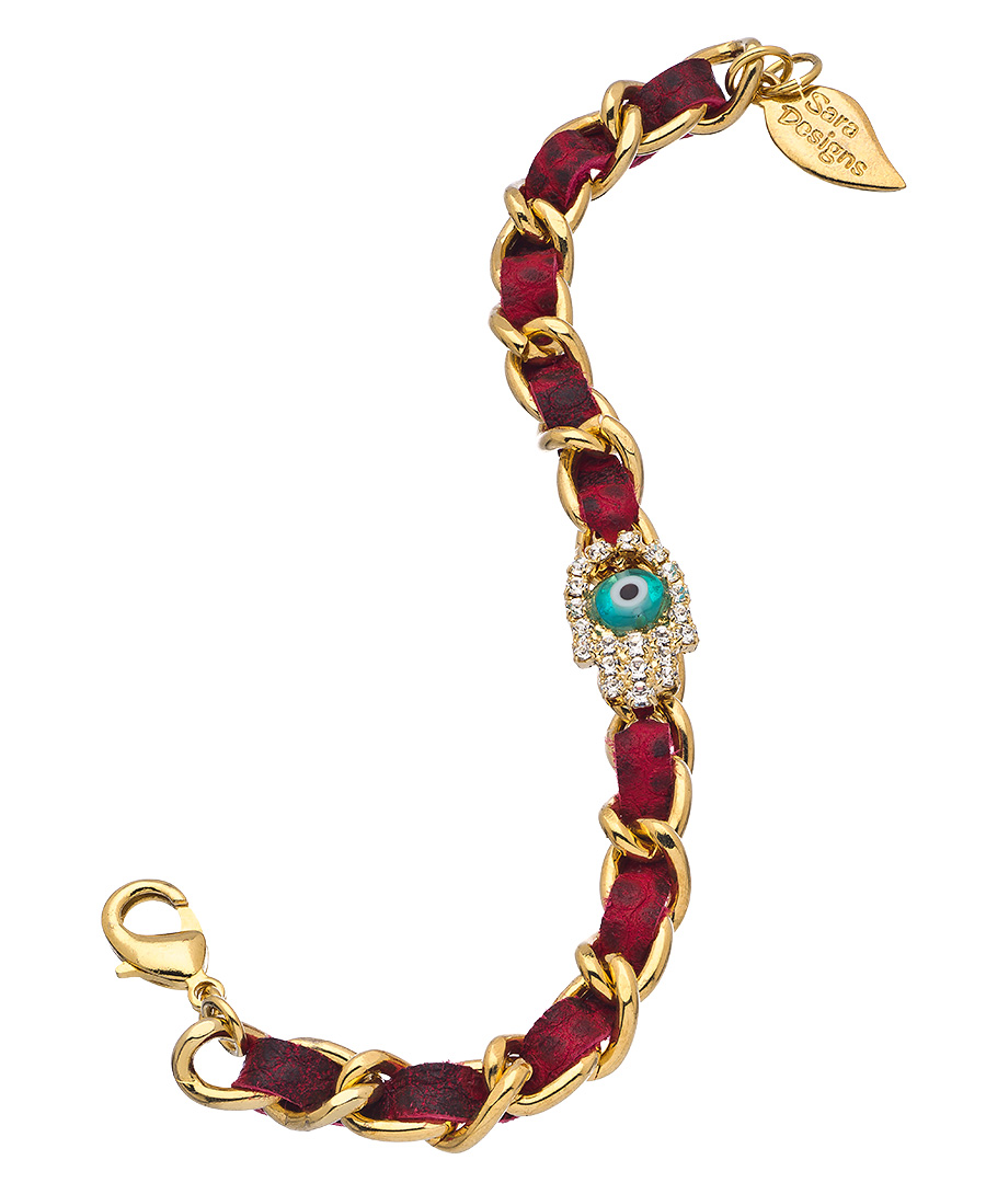 This Sara Designs gold, Swarovski crystal and leather hamsa bracelet features red Italian lambskin leather, woven through a 14k gold plated chain with a gorgeous hamsa/evil eye detail. Combining two iconic symbols in a most appealing way, this bracelet fastens with a lobster claw clasp and is perfect for everyday.