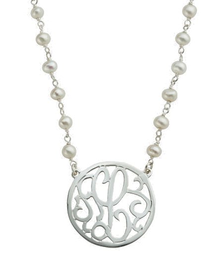 Indulge scroll initial pearl necklace is a fantastic piece. Sterling silver 1 1/4" scroll letter pendant hangs on a 16" authentic pearl chain. This necklace will be treasured forever.