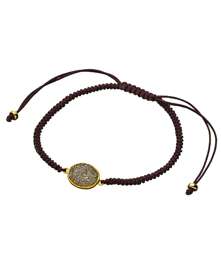 Embrace the wonderful simplicity of the silver oval druzy cotton bracelet from Seraphina. A silver druzy stone takes its place in the center surrounded by a gold colored border. The bracelet is carefully braided and includes gold colored beads at each end.