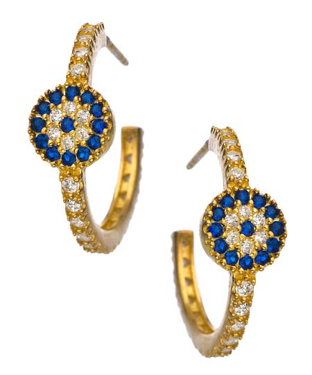 These gorgeous CZ evil eye hoop earrings are Seraphina's modern spin on the centuries-old design. Legend has it that lucky 'evil eyes' keep their wearers in good fortune's favor. The earrings come in your choice of 24k gold over silver or sterling silver. Whichever you choose, you'll look amazing!