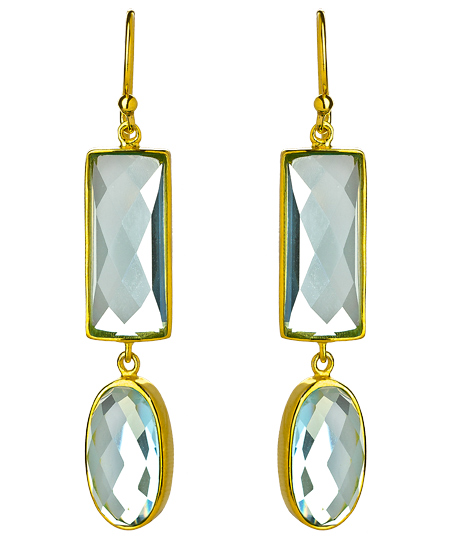 Let these double aqua drop wire earrings from Seraphina breathe new life into your outfit. A rectangle crystal leads down to an oval faceted crystal, both of which are set in gold plating. These earrings fasten with French wire back closures for pierced ears.