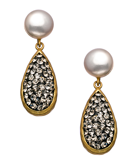 These Seraphina gold, pearl and black diamond crystal teardrop earrings are a study in luxury. Contrasting black pave crystals in a teardrop shaped, gold bezel setting are hung from gleaming pearls that rest on your ear lobes. Earrings have a post closure for pierced ears.