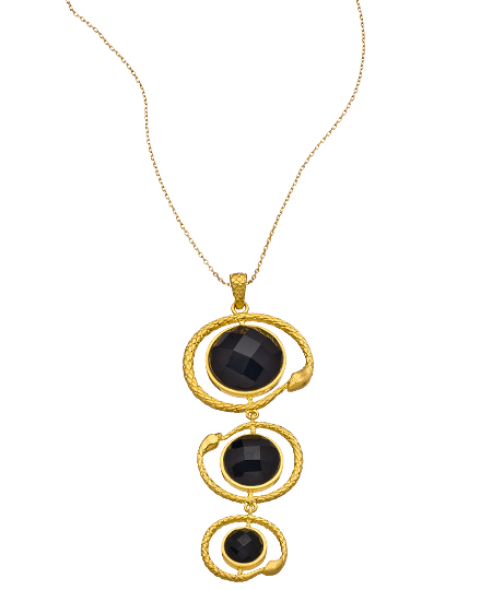 Who could resist this gold plated serpent pendant necklace with three black onyx stones from Seraphina? Wear these snakes on a plane, or anywhere! Three faceted, graduated stones are captured by serpents of gold plated wire. Accessorize any outfit with this charming necklace.