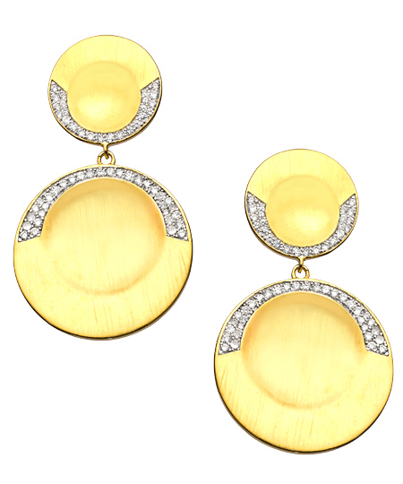 These stunning gold double round drop earrings from Seraphina are artisan quality - with the half-rounds of sparkling cz stones that embellish the matte gold, dish-shaped discs. The smaller disc supports the post closure for pierced ears, while the larger disc dangles below. These unique earrings will get rave reviews!