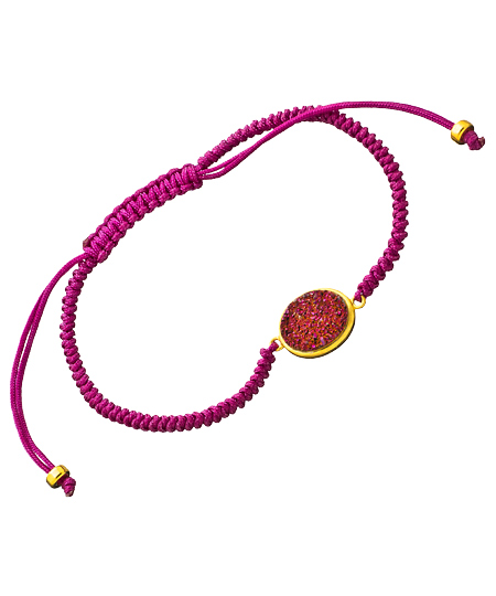 There's some great fun to be had with the purple on purple oval druzy cotton bracelet from Seraphina. The purples of the cord and druzy stone are a match made in heaven. Adjust the size of the bracelet by pulling on the draw strings.