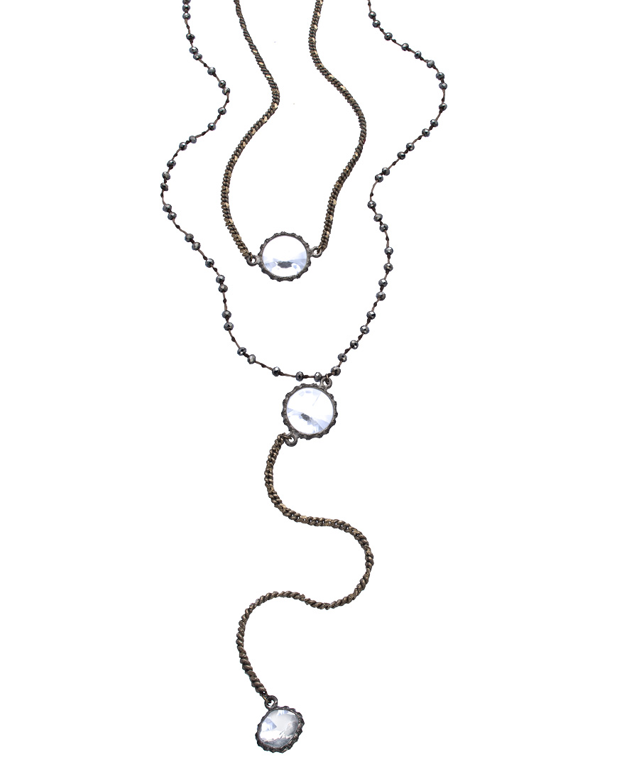 Whimsical, lovely and perfect for you, this Serefina silver, crystal and pyrite vintage deco channels necklace is exquisitely designed and artisan crafted. Bold, round crystals are prominently featured, enhanced by pyrite beads and a sunning silver chain. A flirty, dropped chain is capped with the sultry sparklers. Necklace fastens with a spring clasp.
