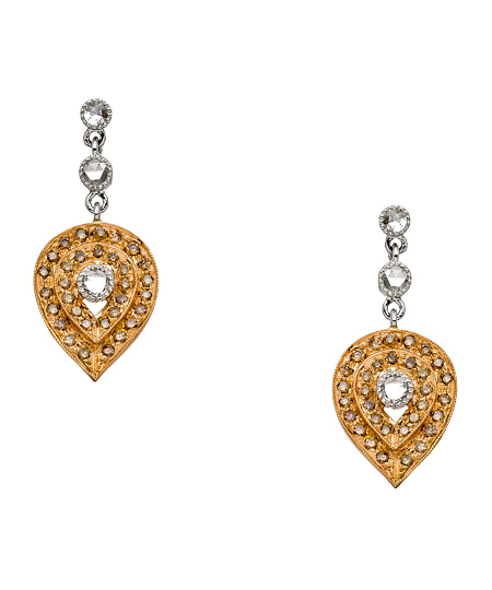 The Sethi Couture rose cut champagne diamond petal earrings are to die for. This small dangling pair is as unique as can be with champagne diamonds covering a rose gold petal shape. Three rose cut diamonds add the perfect finishing touch, lining the center of the earrings.
